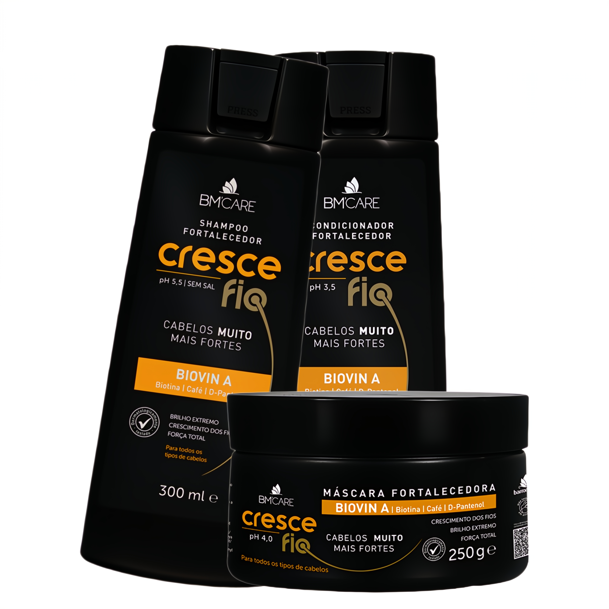 Com Biovin A, Biotina, Café e D‑Pantenol, o Kit Crescimento e Força BARROMINAS Cresce Fio – Shampoo, Condicionador e Máscara cuida do couro cabeludo e dos fios de forma completa. Ele limpa sem agredir, trata de dentro pra fora e ajuda no crescimento visível do cabelo, enquanto reduz a queda e deixa tudo mais forte e encorpado.