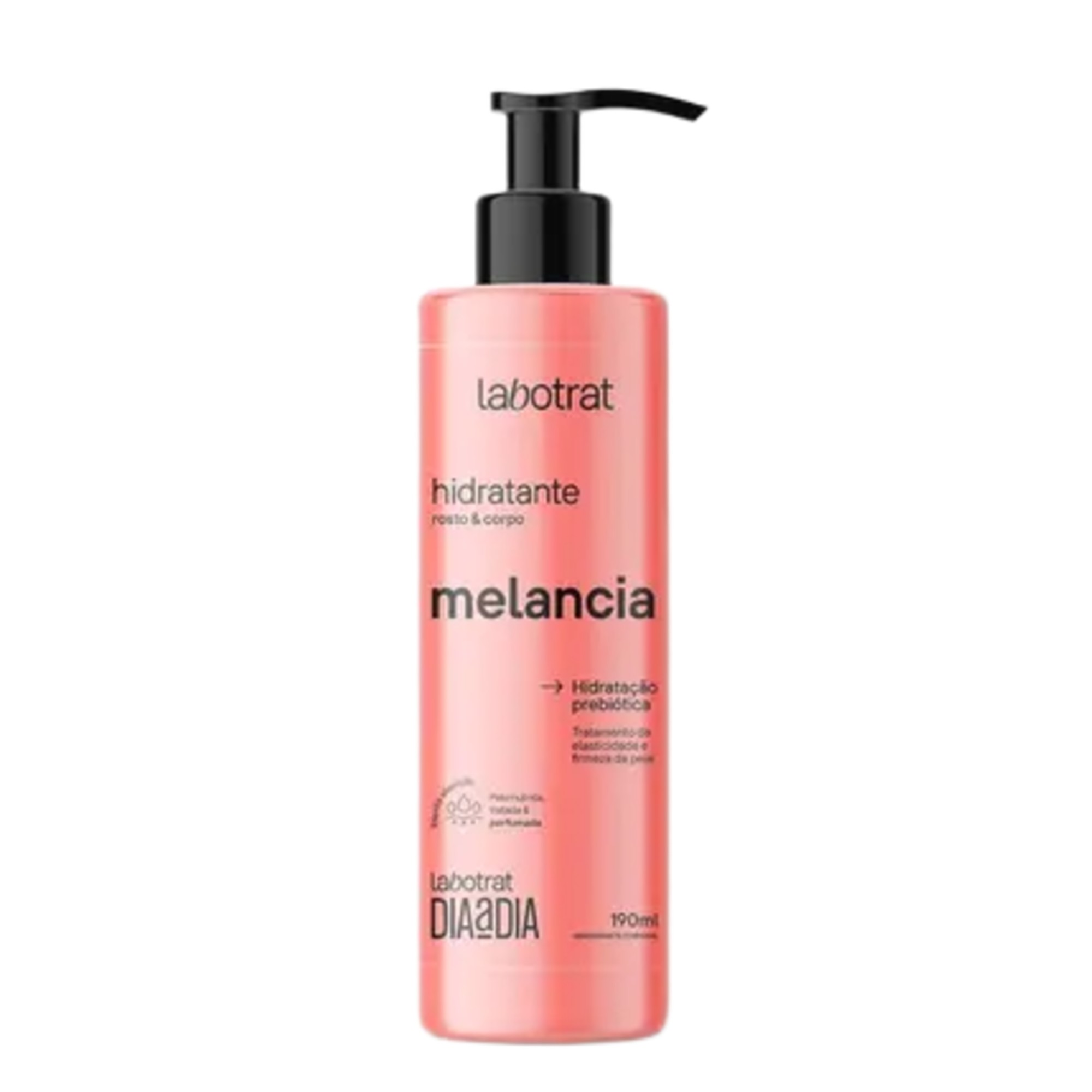 | Características | • Marca: Labotrat – Linha: Dia a Dia; • Produto: Hidratante Rosto e Corpo – Melancia; • Volume: 190 ml; • Textura: cremosa e leve, de rápida absorção; • Fragrância: aroma frutal de melancia, leve e refrescante; • Fórmula livre de parabenos e não testada em animais. |